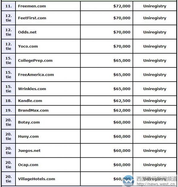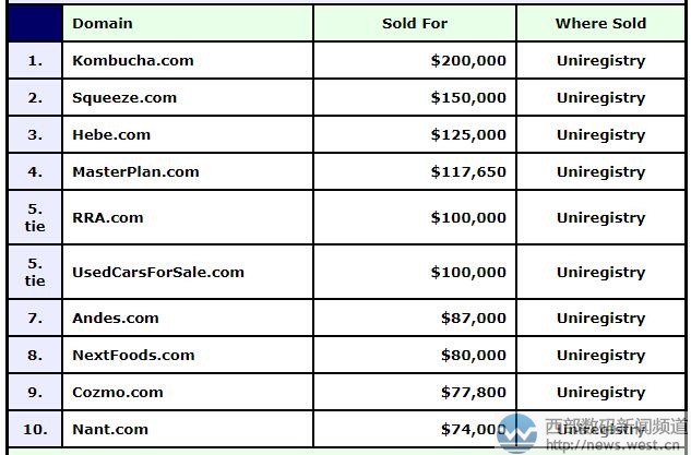 DN榜:印尼“康普茶”竟卖出132万元! 多个英文域名六位数美金成交!西部数码(west.cn)9月21日消息,最新一期的DN榜(9.11-9.17)被Uniregistry平台此前交易但未公布价格的域名占据。其中,卖价最高的是一枚印尼语域名kombucha.com,成交价为200,000美元,约合人民币132万元。