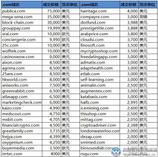 域名publica.com具有“国民”的意思,该域名注册于1996年,距今已有22年历史了。从含义上说,publica.com比较适合搭建公益类项目或者创意平台。搜索发现,目前就有新西兰创意设计代理商publica与之对应,官网启用域名publica.co.nz,另外海外出版经济电子商务平台Publica也与之对应。 排名第二的是组合域名Mega-Sena.com,成交价为35,000美元,约合人民币23万元,该域名直译为“万塞纳”,对应有巴西一个乐透彩票网。同样为扁担域名的block-chain.com,成交价为30,000,是“区块链”的意思,对应有当下火热的区块链行业,具有不错的商业价值。 随后是一枚“支付”类域名grouppay.com,成交价为19,999美元,约合人民币13万元。该域名有“集团支付”的意思,目前已被一家名为GroupPay Inc的公司收购并启用建站。 接下来超五位数美元成交的还有域名xrai.com,成交价为10,000欧元,该域名中含有字母“AI”,有“人工智能”之意,也是当前的热门行业。另外,25c.com和wolftek.com都拍了1万美元,“门房”域名conciergerie.com拍了9990欧元,潜在终端是巴黎裁判所附属监狱。