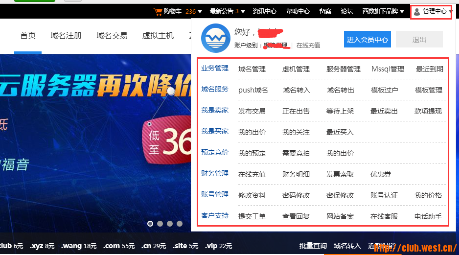 2、增加快捷导航菜单。鼠标放在顶部账号登录位置,展开的下拉菜单中新增快捷导航栏。无论您是要发布交易、push域名、查看出价和关注的域名,以及在线充值、款项提现、域名管理,提交工单及查看回复等等都有相应直达版块。